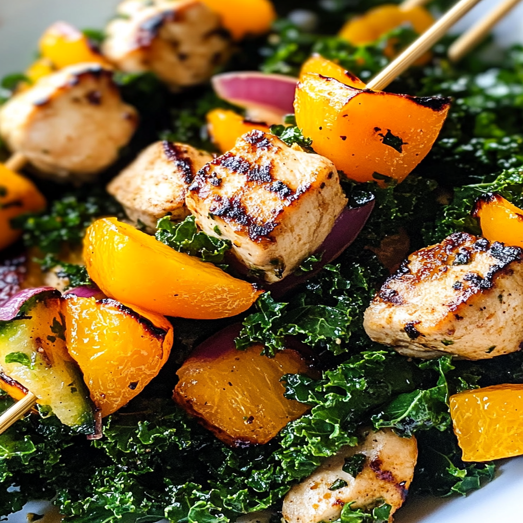 Quick Orange Ginger Kale Salad & Chicken Veggie Kabobs