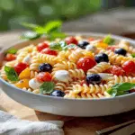 In summary, Patriotic Pasta Salad is not only visually striking but also deliciously flavorful and easy to prepare. By using fresh ingredients like rotini pasta, cherry tomatoes, and mozzarella balls, you create a dish that delights both the eyes and palate. Consider making it ahead of time for convenience and enjoy its versatility at various events throughout the year. Cheesecake Fruit Salad Roll Ups Whether it’s a picnic or a family gathering, this pasta salad will surely be a crowd-pleaser that celebrates good food and good times together!