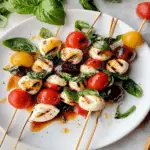 - Arrange skewers on a serving platter and drizzle generously with balsamic glaze.
