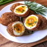 Start by boiling your eggs for about six minutes. Once cooled, wrap each egg in sausage meat, then coat them in breadcrumbs. Deep fry until golden brown for that crunchy perfection, ensuring the inside stays gooey.
