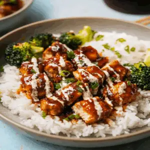 To create the perfect sauce for your STICKY CHICKEN RICE BOWLS, combine soy sauce, honey or brown sugar, garlic, ginger, and sesame oil in a bowl. Whisk these ingredients together until well blended. You can adjust the sweetness or saltiness based on your taste preferences. This sauce will coat the chicken beautifully when cooked, giving it that signature sticky texture and flavor that everyone loves.
