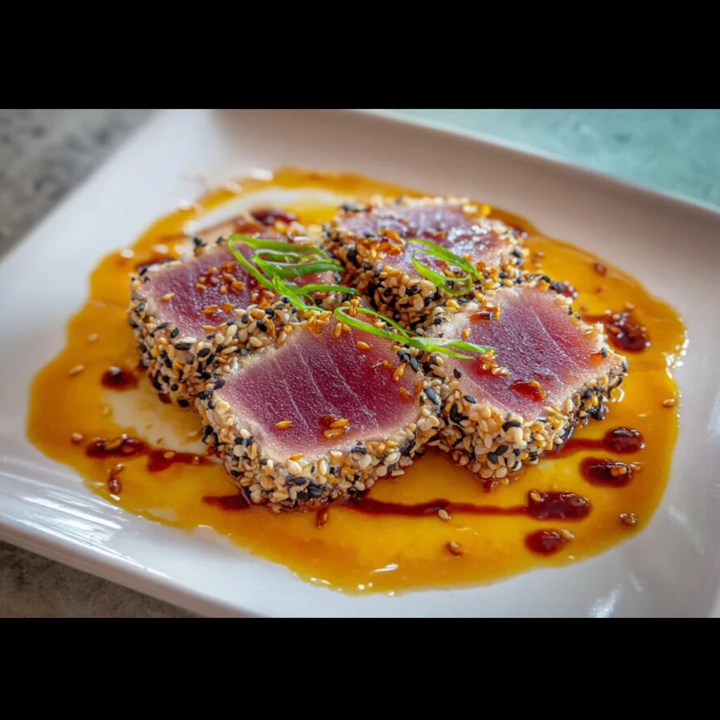 - Arrange the tuna slices on a plate, drizzle with sauce, and sprinkle with sesame seeds and green onions.