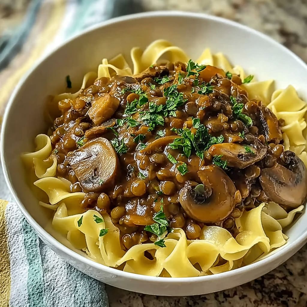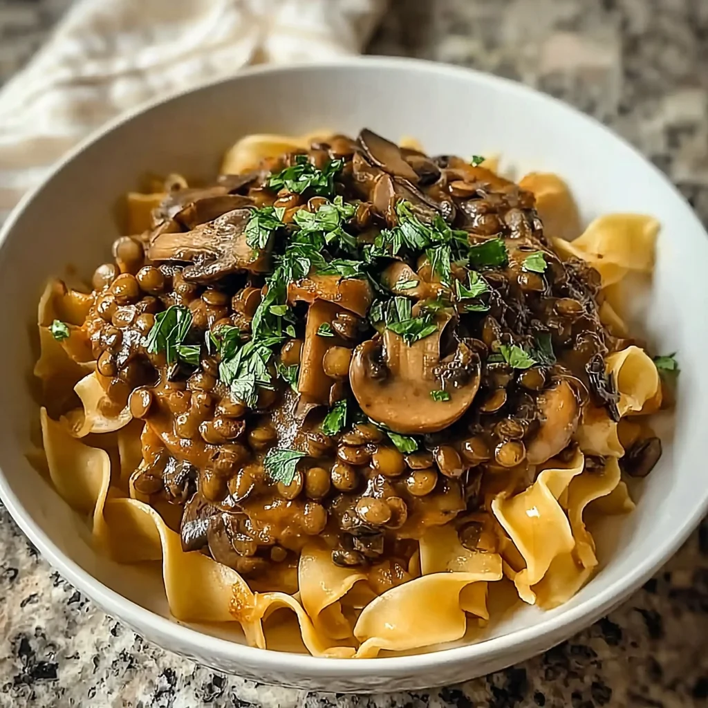 A creamy and hearty vegan stroganoff made with lentils and mushrooms, perfect for a comforting meal.